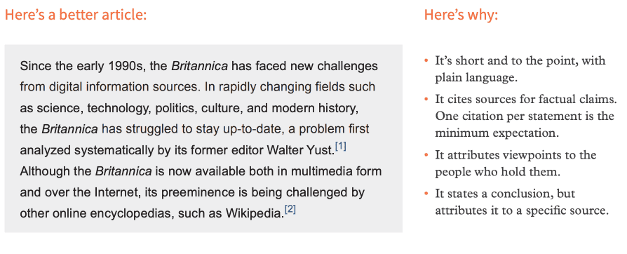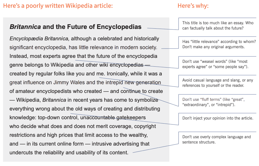 oldid=?You may be used to persuasive styles of writing. On Wikipedia, you don’t want to persuade. Articles don’t take sides, but describe significant viewpoints published in reliable sources. You want to share facts. Wikipedia lets people interpret those facts for themselves. (WikiEdu 2017)