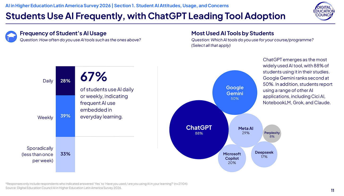Often, the free version of ChatGPT is all students have used or have any interest in using. I fear many have falsely equated student use of one AI tool as a sign that students are even interested in learning anything about how AI works or exploring alternatives. Working with students closely using AI these past three years and I can say with some confidence that very few are deeply interested in using a different AI tool than the one they already use. That’s not just in the USA. The Digital Education Council’s recent 2026 survey about AI use throughout Latin America reveals ChatGPT remains the tool of choice for students: